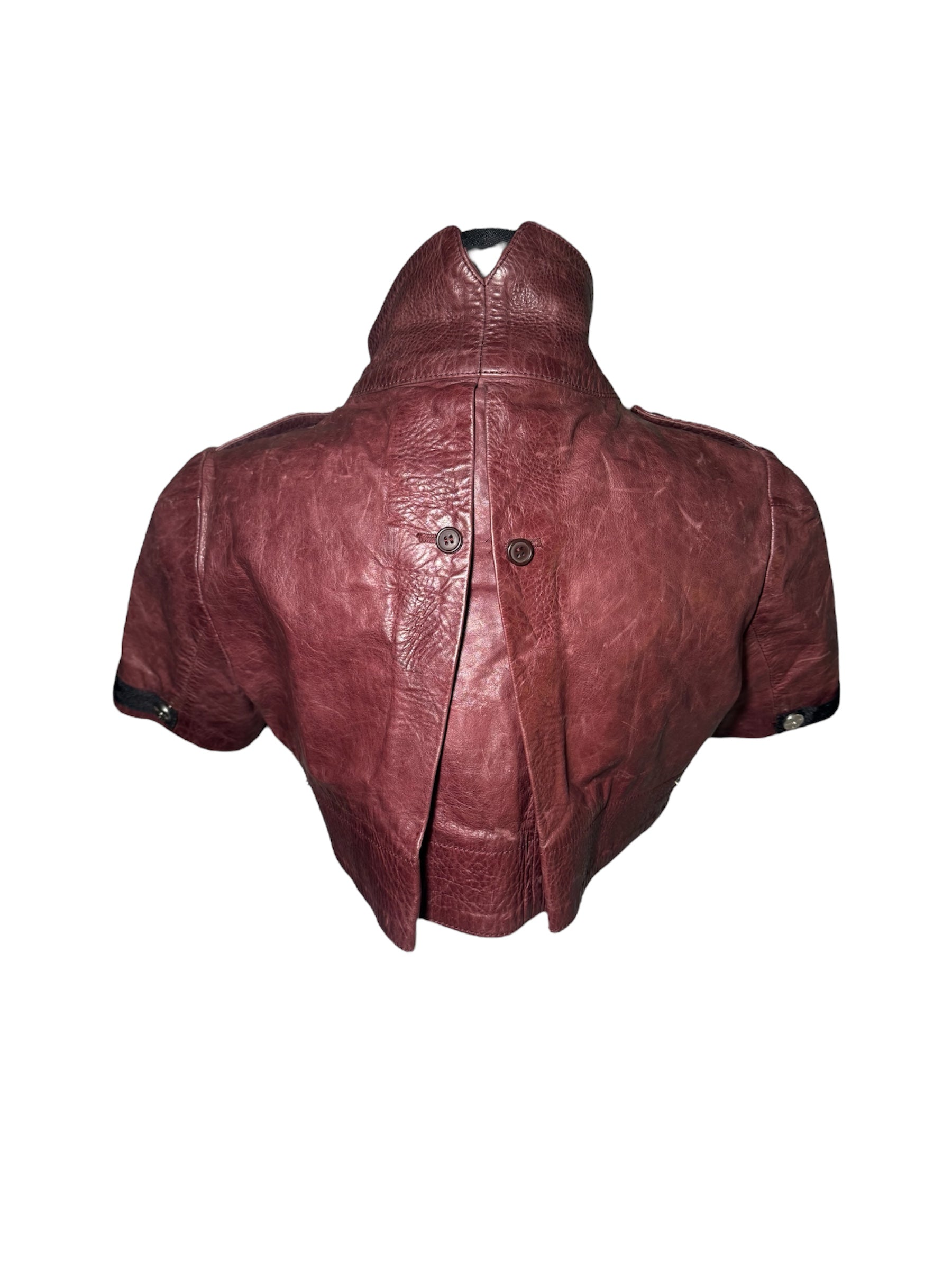 This rare Diesel piece features a cropped silhouette in rich burgundy leather, detailed with structured shoulders and bold button closures. A statement vintage jacket that blends edgy Diesel DNA with timeless style.